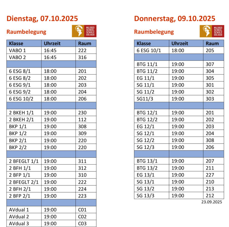 Klassenpflegschaften am 07.10 und 09.10.2025