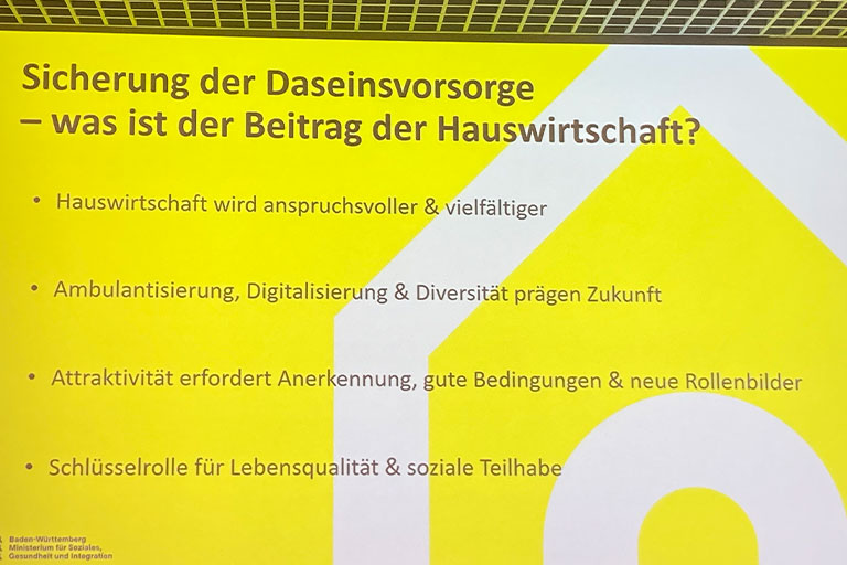 Cem Özdemir (Bundesminister a.D.) betonte in seinem Grußwort den Wert der Hauswirtschaft als gesamtgesellschaftliche Aufgabe. Melanie Wolfers, Bestsellerautorin, Mentorin und Ordensschwester ermutigte mit Impulsen und praktischen Übungen zum Thema Zuversicht. Anschließend dokumentierte Jochen Ziegler vom Ministerium für Soziales, Gesundheit und Integration den Beitrag der Hauswirtschaft zur Daseinsvorsorge.
