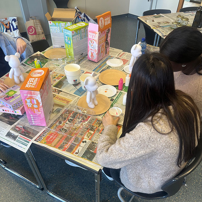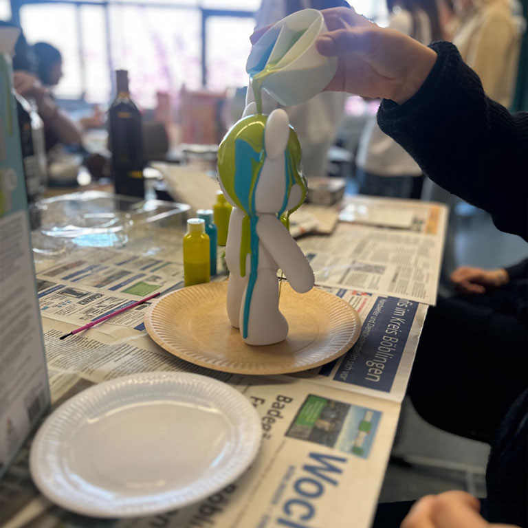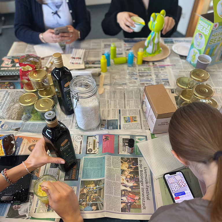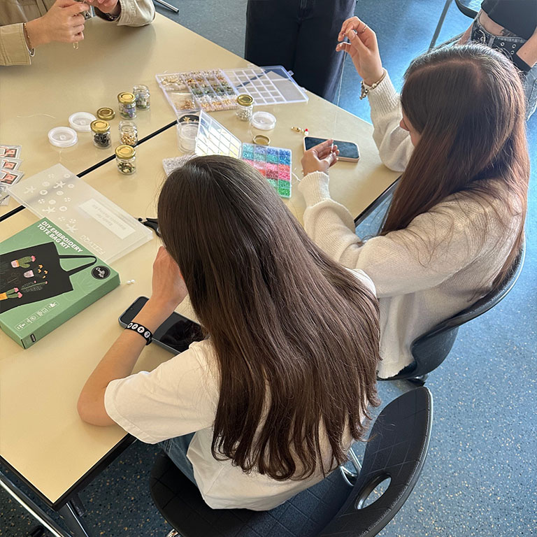 Neben offenen Lernräumen für die individuelle oder auch klassenübergreifende Prüfungsvorbereitung gab es vielfältige kreative Angebote von Frau Schaab: Body Scrubs herstellen, Marble-Bären gestalten, Perlenschmuck kreieren, Kacheln bemalen oder eigene Vision Boards erstellen.