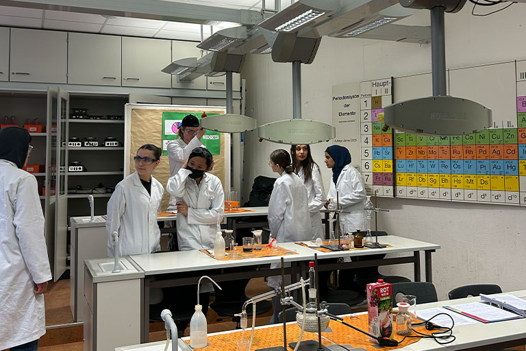 Ein anschließender Rundgang durch das Schulgebäude machte die Vielfalt der angebotenen Bildungsgänge und weiteren Angebote deutlich: Besucher:innen hatten die Möglichkeit, spannende Experimente aus den naturwissenschaftlichen Profilen des biotechnologischen (BTG) und ernährungswissenschaftlichen Gymnasiums (EG) sowie der Berufsfachschule für Labortechnik (BFLT) zu erleben. Der philosophischen Garten bot Raum für tiefergehende Fragen, im Reli-Raum wurde stündlich gemeinsam gesungen und die PäPsy-Lounge lieferte Interessierten am sozialwissenschaftlichen Gymnasium (SGGS) Informationen über das Profilfach Pädagogik und Psychologie.